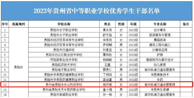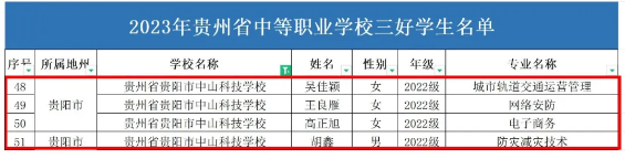 我校吴佳颖、王良雁、高正旭、胡鑫同学获“2023年贵州省中等职业学校三好学生”、胡丹妮同学获“2023年贵州省中等职业学校优秀学生干部”荣誉称号。