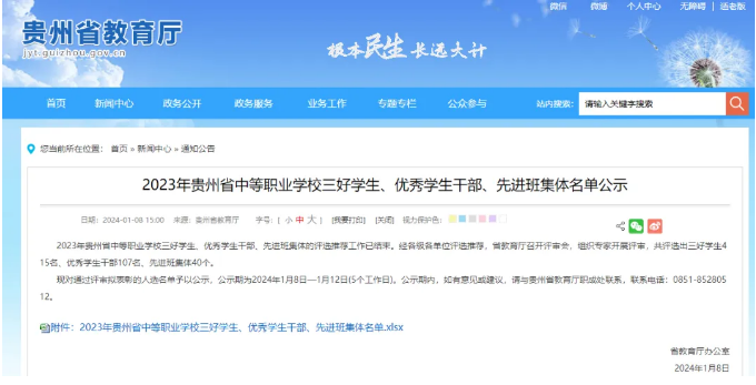 1月8日 贵州省教育厅公布了 2023年贵州省中等职业学校 省级三好学生、优秀学生干部 和先进班集体拟表彰名单公示 我校吴佳颖、王良雁、高正旭、胡鑫同学获“2023年贵州..