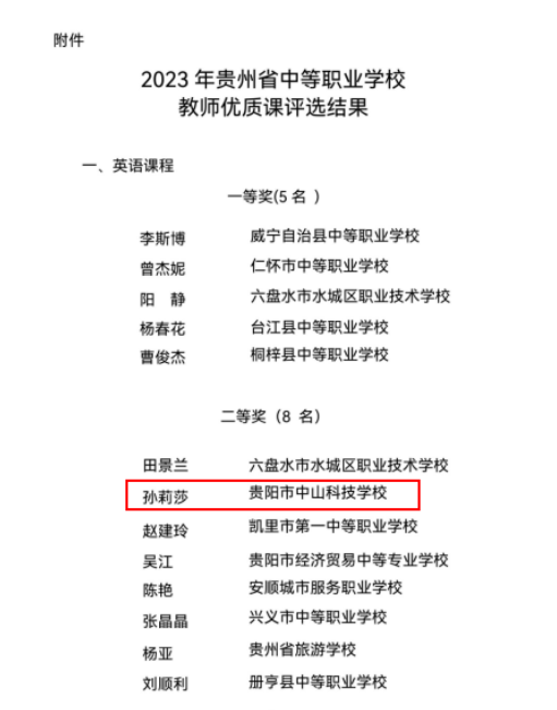 近日,贵州省中等职业学校教师优质课大赛近日圆满落幕,我校教师孙莉莎凭借出色的教学实力和严谨的教学态度,荣获大赛二等奖。 本次大赛旨在提高中等职业学校教师的教学水平,促进教育教学改革,提高人才培养质量。来自全省各地的优秀教师代..